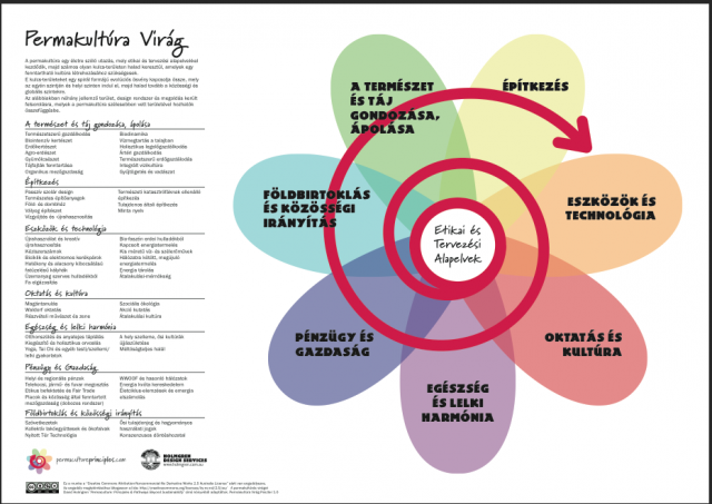 Van egy nagyon szemléletes ábra, a Permakultúra virága, amin keresztül könnyebben megérthetjük a permakultúrás szemlélettel fejlesztett társadalom fő strukturális elemeit.