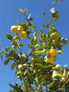 Citrusok. Még rajta van a termés, de már tombolva virágzik és illatozik. Erős, felnőtt fák, életük, erejük teljében.