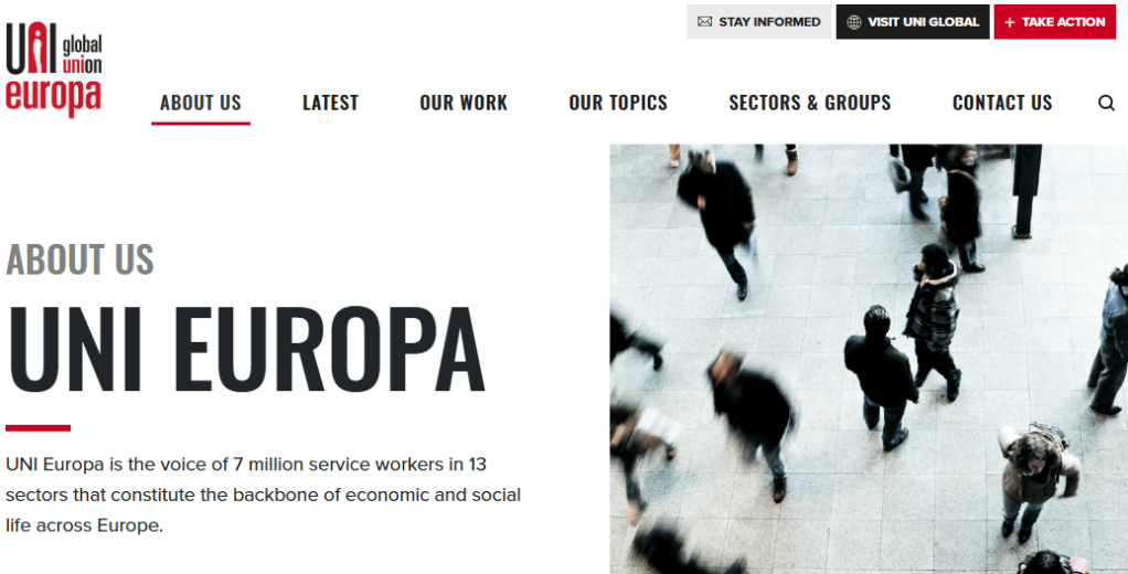 Mi például arra törekszünk, hogy az idősgondozásban érintett családok és ápolók hangját hangosítsuk Magyarországon és az EU-ban egyaránt. Ennek a munkának a részeként együttműködünk az UNI-Europa-val. Az UNI Europa az európai szolgáltatási szektor szakszervezeti szövetsége, amely 50 ország 200+ szakszervezetén keresztül mintegy 7 millió munkavállalót képvisel. A brüsszeli székhelyű szervezet a UNI Global Union európai régiója, és célja a tisztességes bérek, a jobb munkakörülmények és a kollektív szerződések előmozdítása a szolgáltatási ágazatokban.